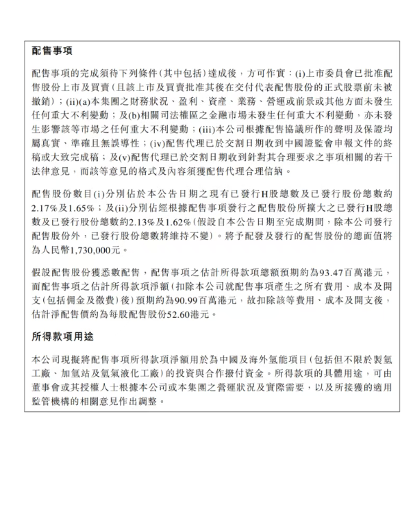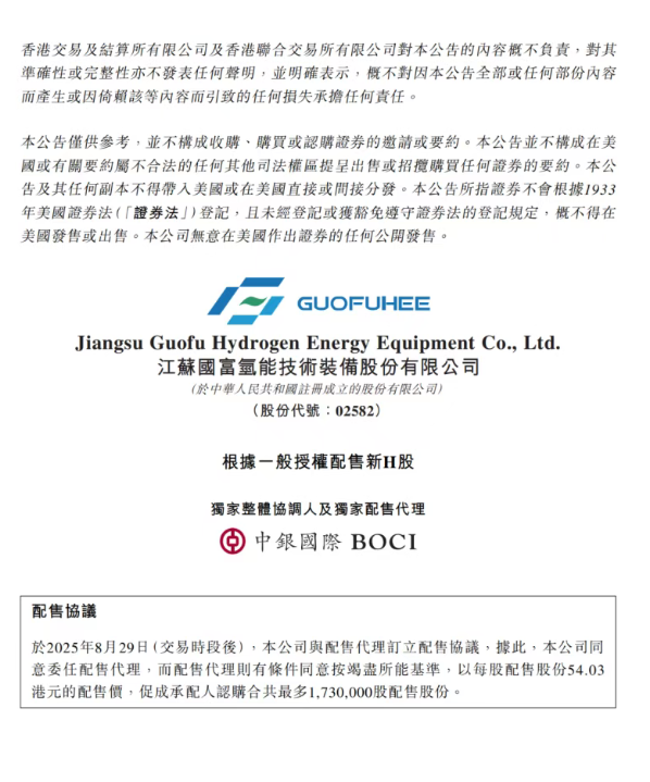 8月31日,國富氫能在港交所公告,擬配售173萬股H股,配售價格為每股54.03港元,預計配售事項所得款項凈額約為9099萬港元。此次配售所得款項擬用于中國及海外氫能項目(包括但不限于制氫工廠、加氫站及氫氣液化工廠)的投資與合作。